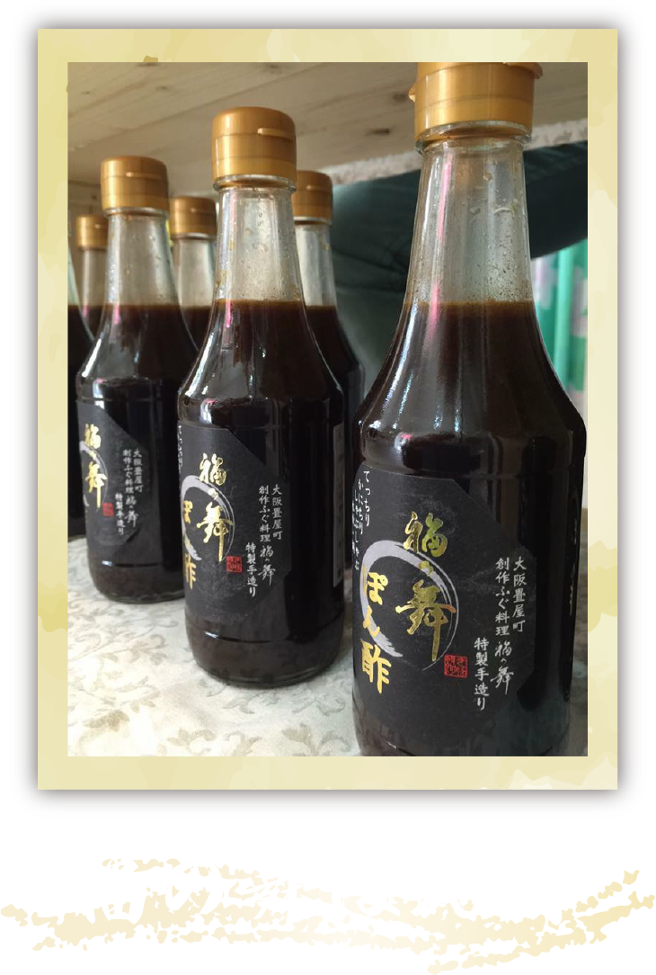 北新地と心斎橋にあるふぐ料理店“福の舞”が、お客様に最高のふぐを食べていただくために、こだわり抜いたぽん酢です。 北新地と心斎橋にあるふぐ料理店“福の舞”が、お客様に最高のふぐを食べていただくために、こだわり抜いたぽん酢です。